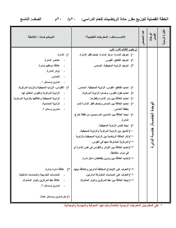 الخطة الفصلية لتوزيع المقرر الصف التاسع رياضيات الفصل الثاني المناهج الع مانية